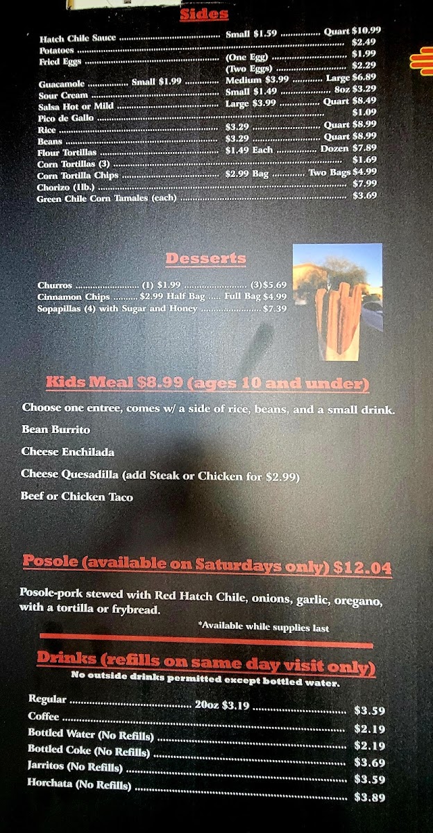 The menu is structured to facilitate casual dining and quick ordering, accommodating a range of meal occasions from breakfast through dinner. Visitors can expect a selection of both lighter snacks and full meals featuring authentic New Mexican and Southwestern cuisine.