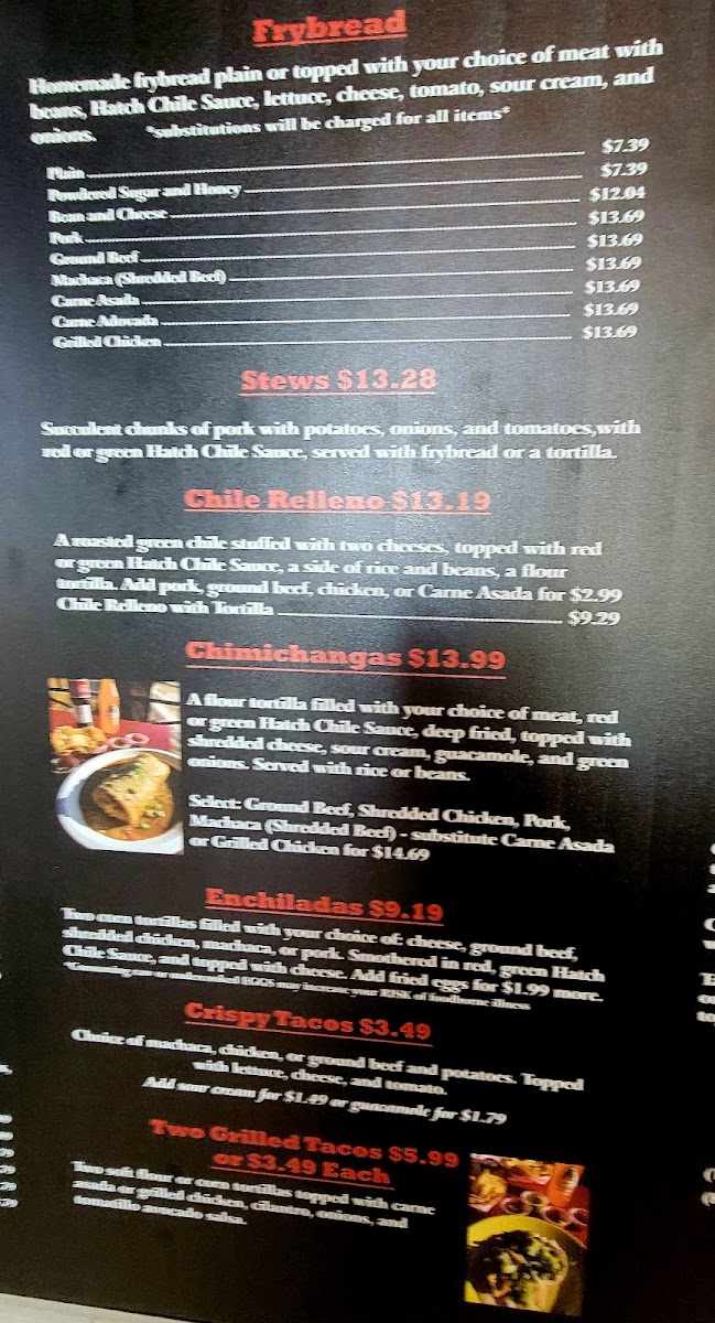 Main Dishes and Platters: The menu highlights combination platters such as the Green Chile Pork Burrito Combination Platter, Taco Plate, and the New Mexican Bowl. Stews like Green Chili Pork Stew and a bowl of Green Chile Stew served with Fry Bread are also offered, contributing to hearty meal options.
